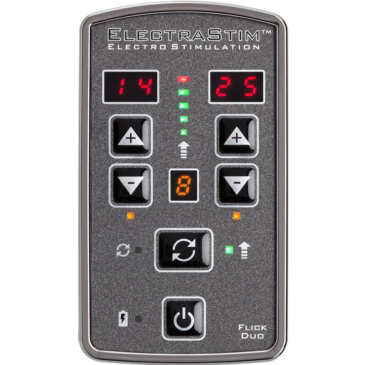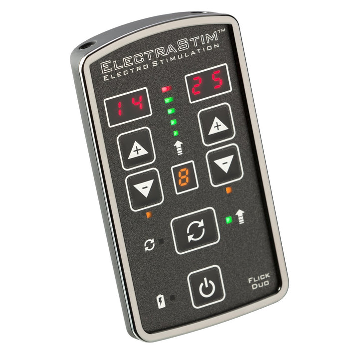 A revolution in electro stimulation technology the ElectraStim Flick Duo not only has 8 built-in dual channel programs including escalating patterns but is also able to stimulate in rhythm with the movements of the control unit! Whether you simply want to add your own stimulation "beat" or want to stimulate in direct sympathy with your own wrist movements during masturbation, this patent pending feature will be like nothing you have tried before! The Flick feature can be slow or fast, soft or hard - it will mimic the sensation that suites your, or your partners, desire.