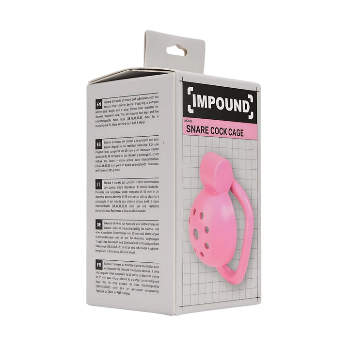 Lock in desire with the Impound Snare Cock Cage - a lightweight and secure male chastity device designed for long-term comfort and total control. Made from durable ABS and metal, this breathable, pink cage comes with five different base ring sizes to ensure the perfect fit. Ideal for beginners or experienced users, the Snare offers a snug 60mm total length with a compact 23mm cage body. Whether you're exploring chastity play or reinforcing submission, this cage delivers security with style.