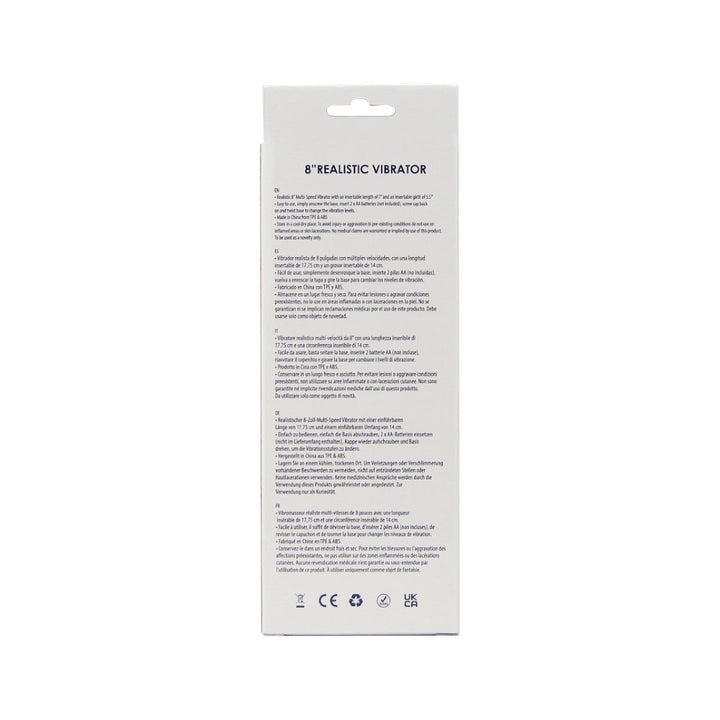 Immerse yourself in the lifelike details and realistic textures of this 8-inch pleasure powerhouse. The carefully designed contours and features authentically mimic the feel of the real thing, ensuring a satisfying and arousing encounter. With an ideal length of 8 inches, this vibrator strikes the perfect balance between substantial satisfaction and manageable convenience. Whether you're a seasoned enthusiast or exploring new realms of pleasure, this size caters to a diverse range of desires.